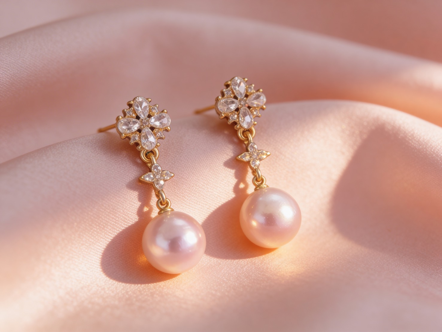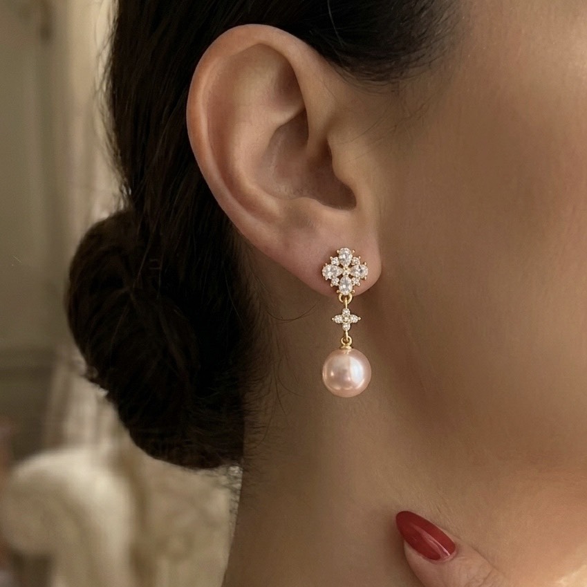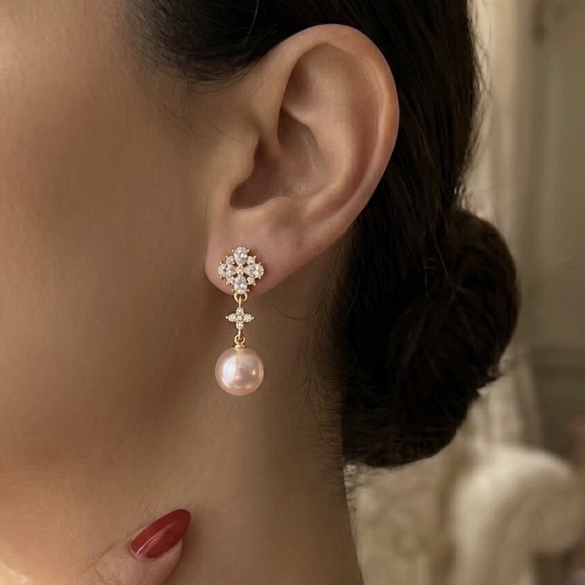 這款宮廷圓舞曲珍珠耳環設計展現了古典華麗與浪漫氛圍,頂部的花綻鋯石鑲嵌與下方粉嫩珍珠相呼應,極具層次美.