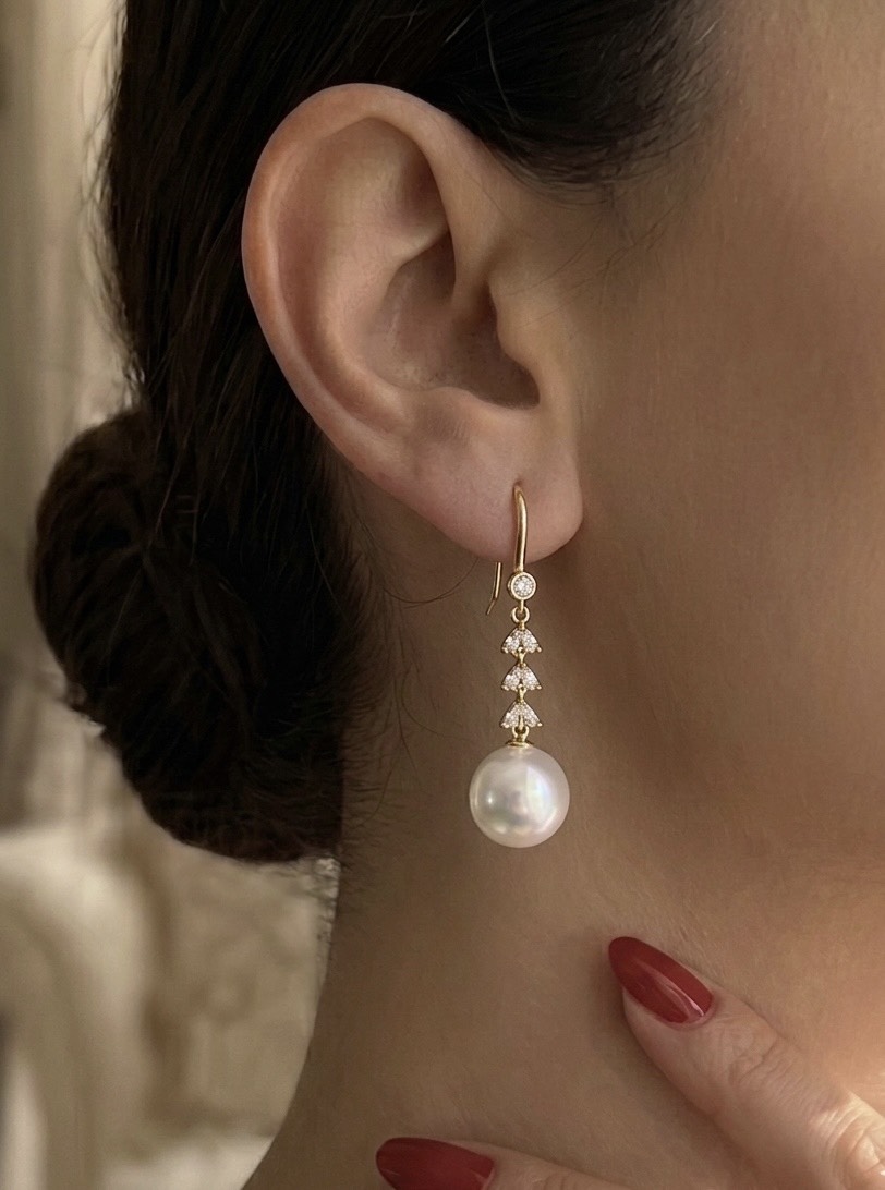 這款耳環採用經典的法式復古長款設計,結合現代簡約幾何元素,溫潤的珍珠增添層次美感