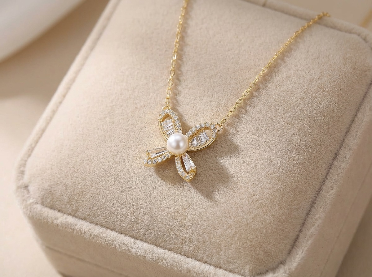 鋯石半鑲鑽珍珠四葉草 金 項鍊