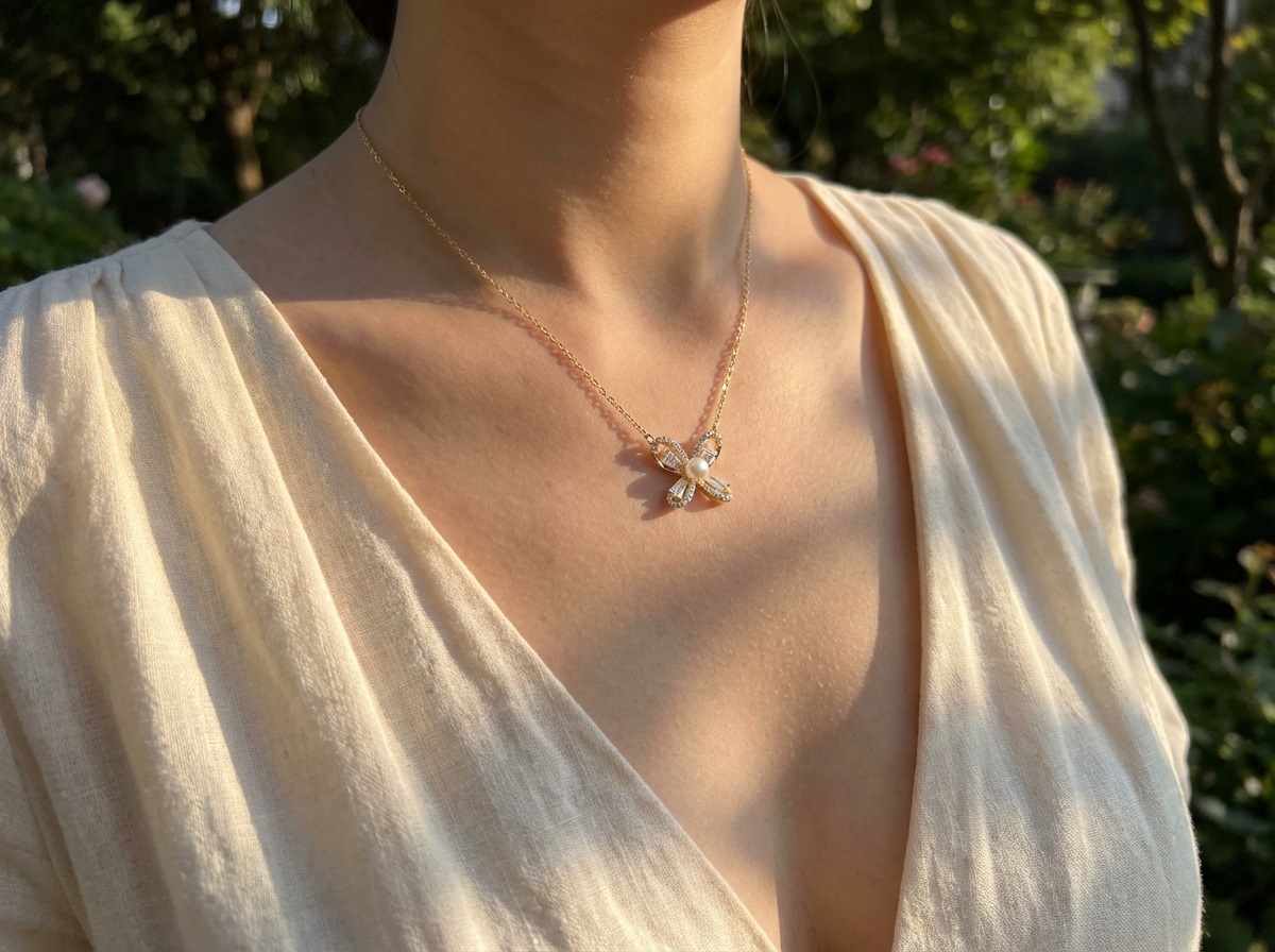 這款項鍊結合了經典的珍珠與靈動的蝴蝶造型,設計風格溫柔且富有層次感。